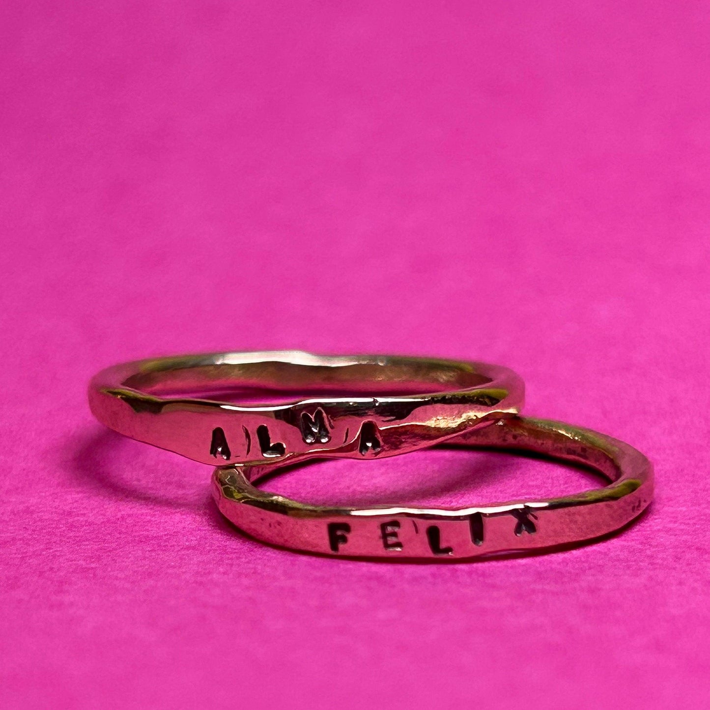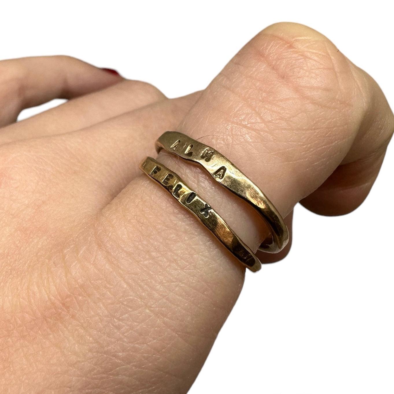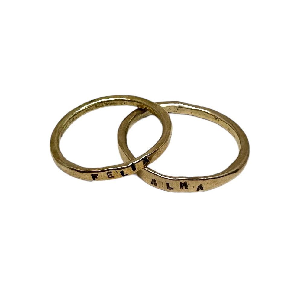 This name ring is made of 18K gold and can be stamped. The ring is 2mm thick and it is only possible to get BIG letters .