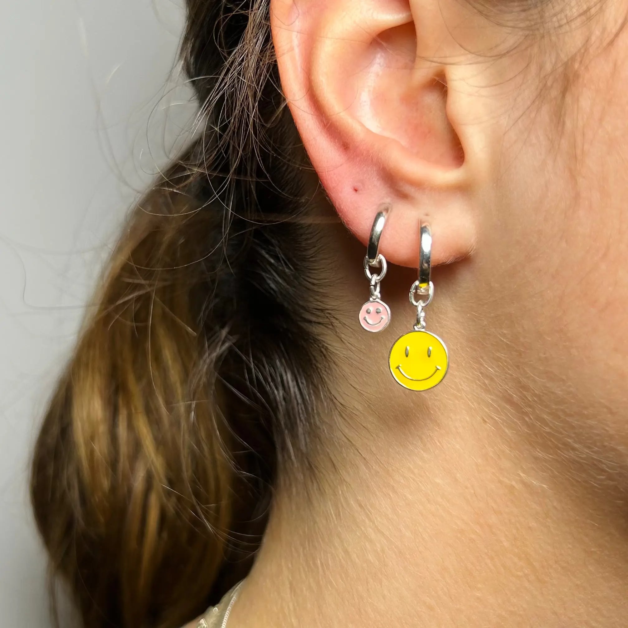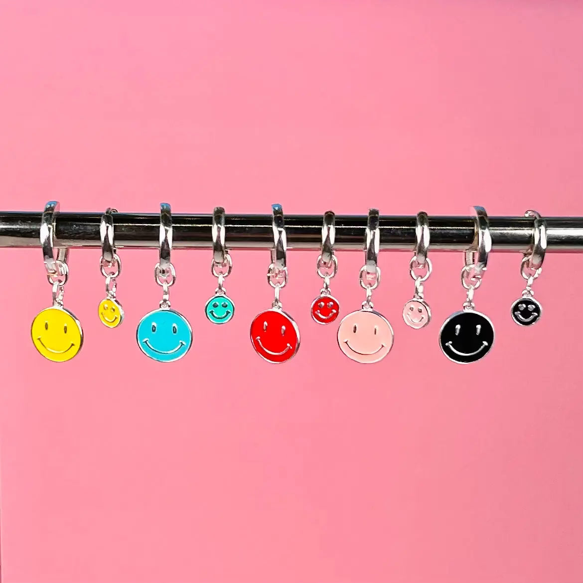 The smiley comes in two sizes. Large and small. There are five different colors of the smiley: turquoise, pink, yellow, red & black.