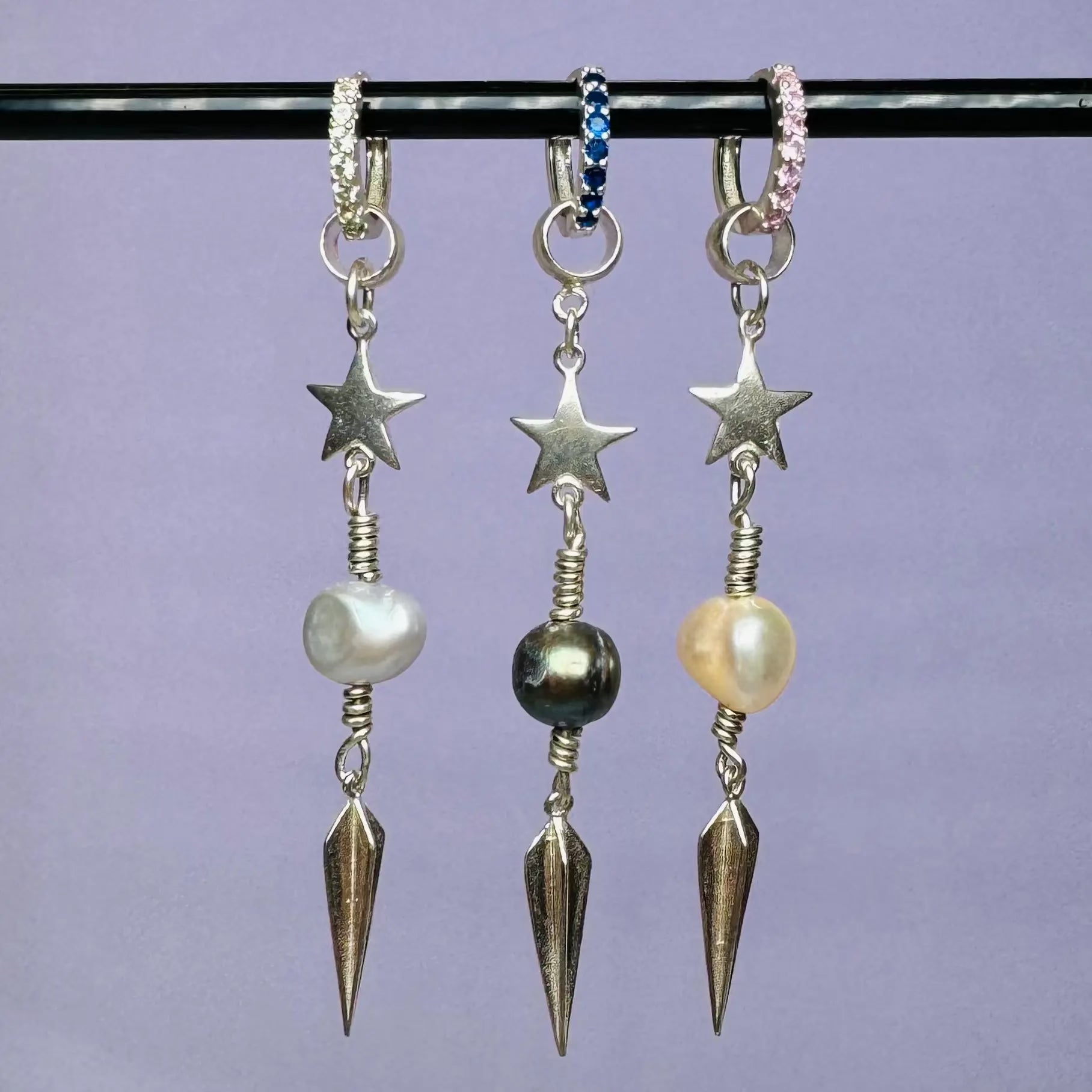 Niin kauniit korvakorut, joissa on yksinkertainen tähti ja helmi.