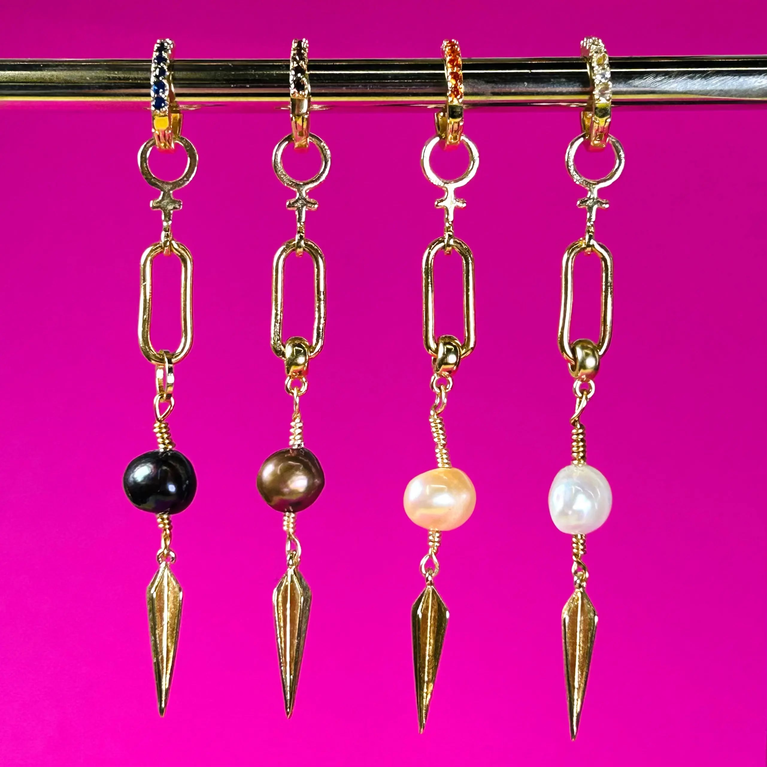 Dessa snygga coola pärlörhängen med venustecken är gjorda i gulddouble (18K på mässing) och med äkta pärla.