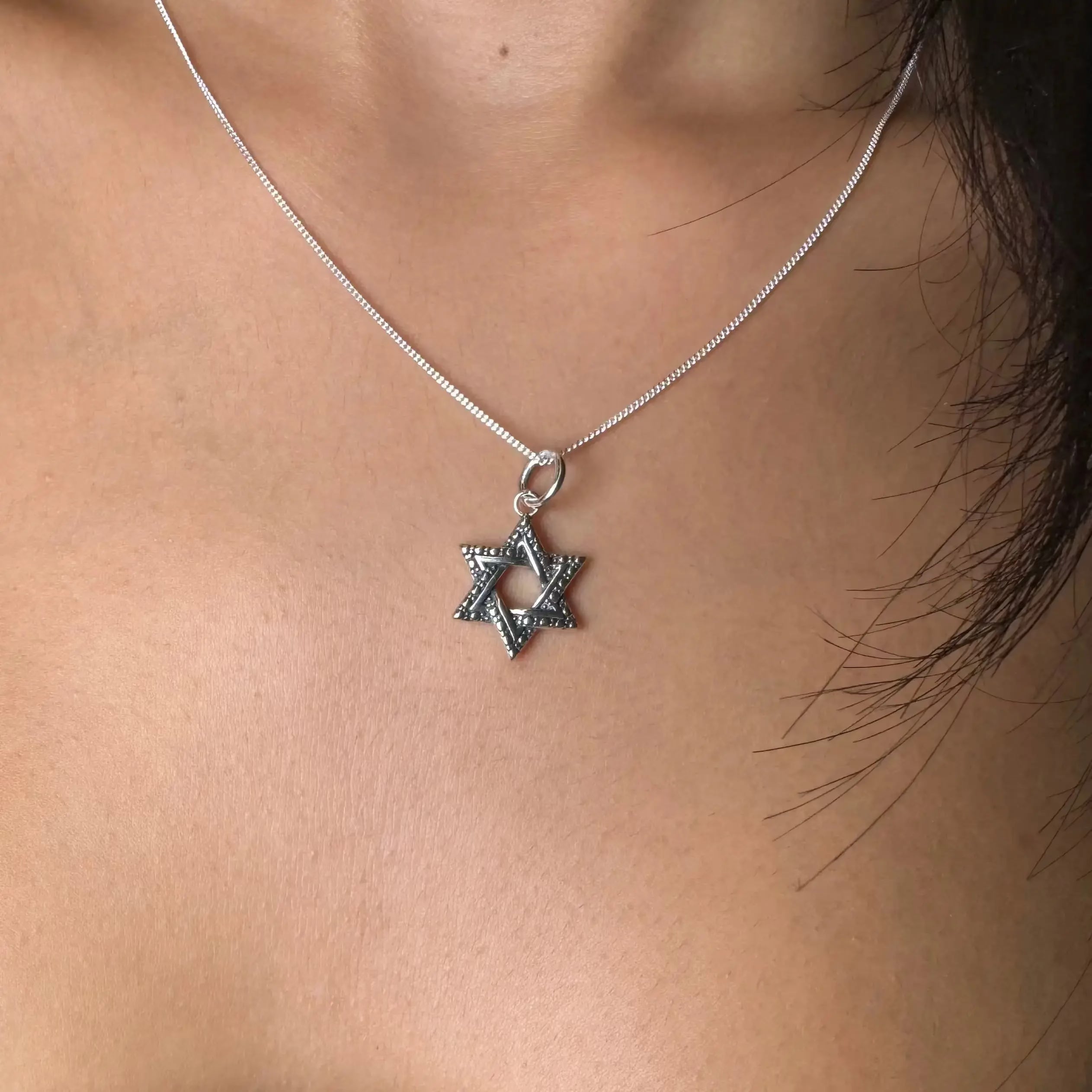 Så fin davidsstjärna som passar perfekt på tjejer liksom killar med en detaljerad davidsstjärna med svarta zirkoner i ett tvinnat mönster.