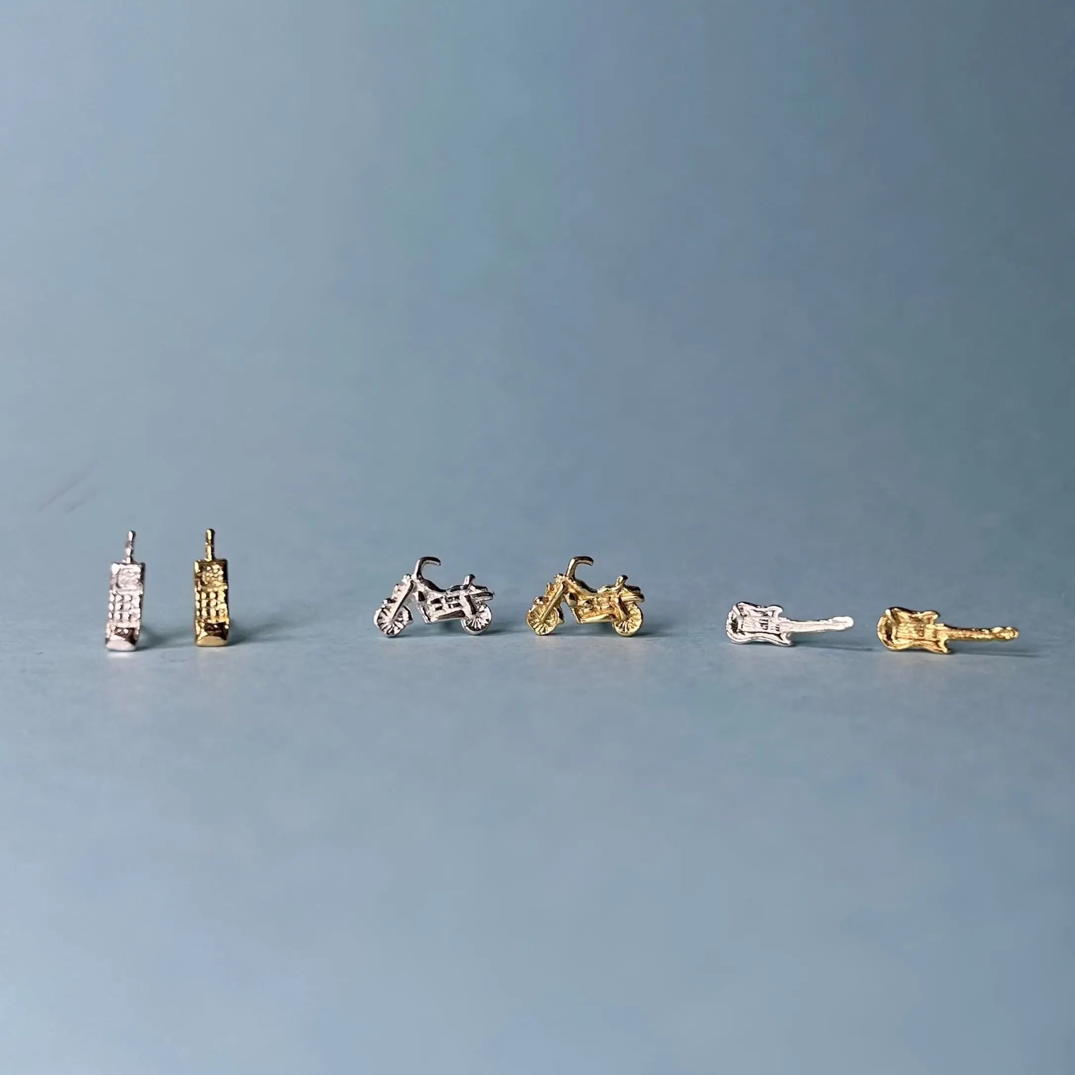 Det finns tre olika örhängen. Motorcykel, elgitarr & telefon i både silver och gulddouble.